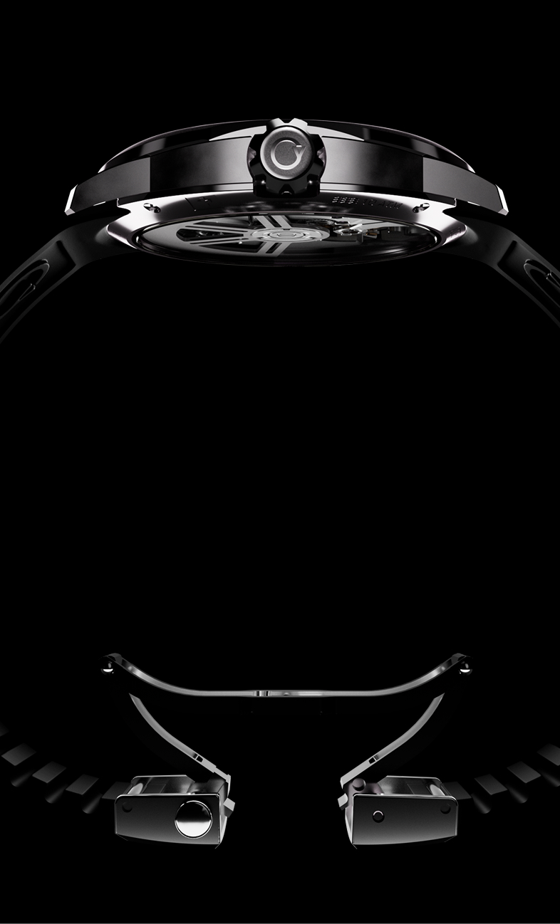 Creating a complex web engineered to enhance ergonomics and wearer comfort. The soft flowing lines are contrasted by defined borders and strong lugs, a fine balance intended to please the eye and the wrist.